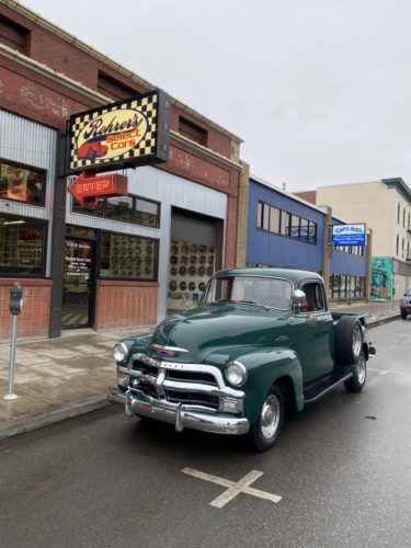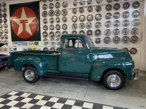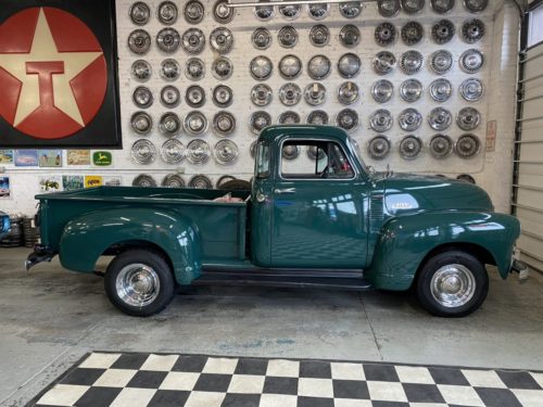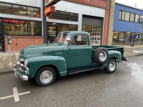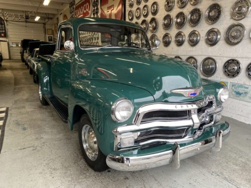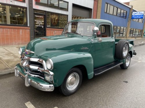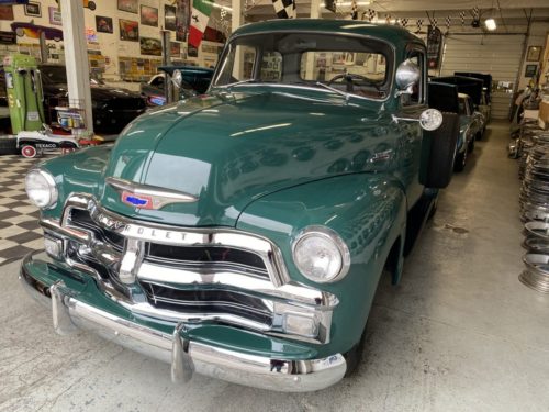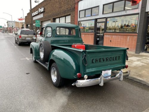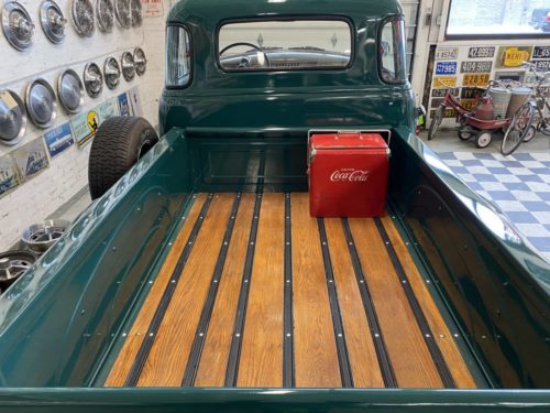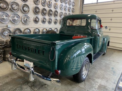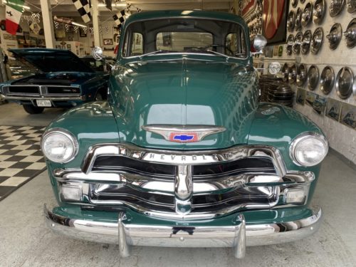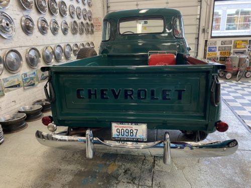 1954 Chevrolet 3100 pickup, 5 window, 4 speed, 235 6 cylinder engine, very original, green with original interior, rare split bench seat, nice chrome, nice wood bed, 6 volt, new wiring, new tires, runs and drives wonderful!